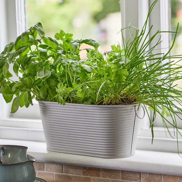 Durable metal planter. Perfect for window sills, balconies and patios. Galvanised steel for long life.