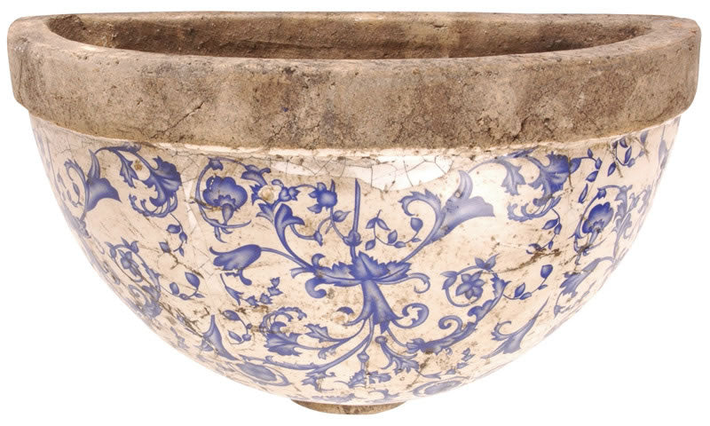 Ceramic half round wall planter with blue Aged Ceramic print. Attaches to wall with 2 screws (not included). Volume - 1.2 litres. Dimensions 27.5 x 11.9 x 17.5cm.