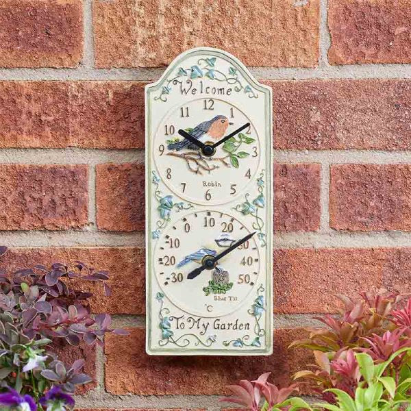 Arabic numbers and skip hand movement. Quartz accuracy with Centigrade reading. Weather resistant hand-painted polyresin. For both indoor and outdoor use. 28.5 x 12 x 2 cm.