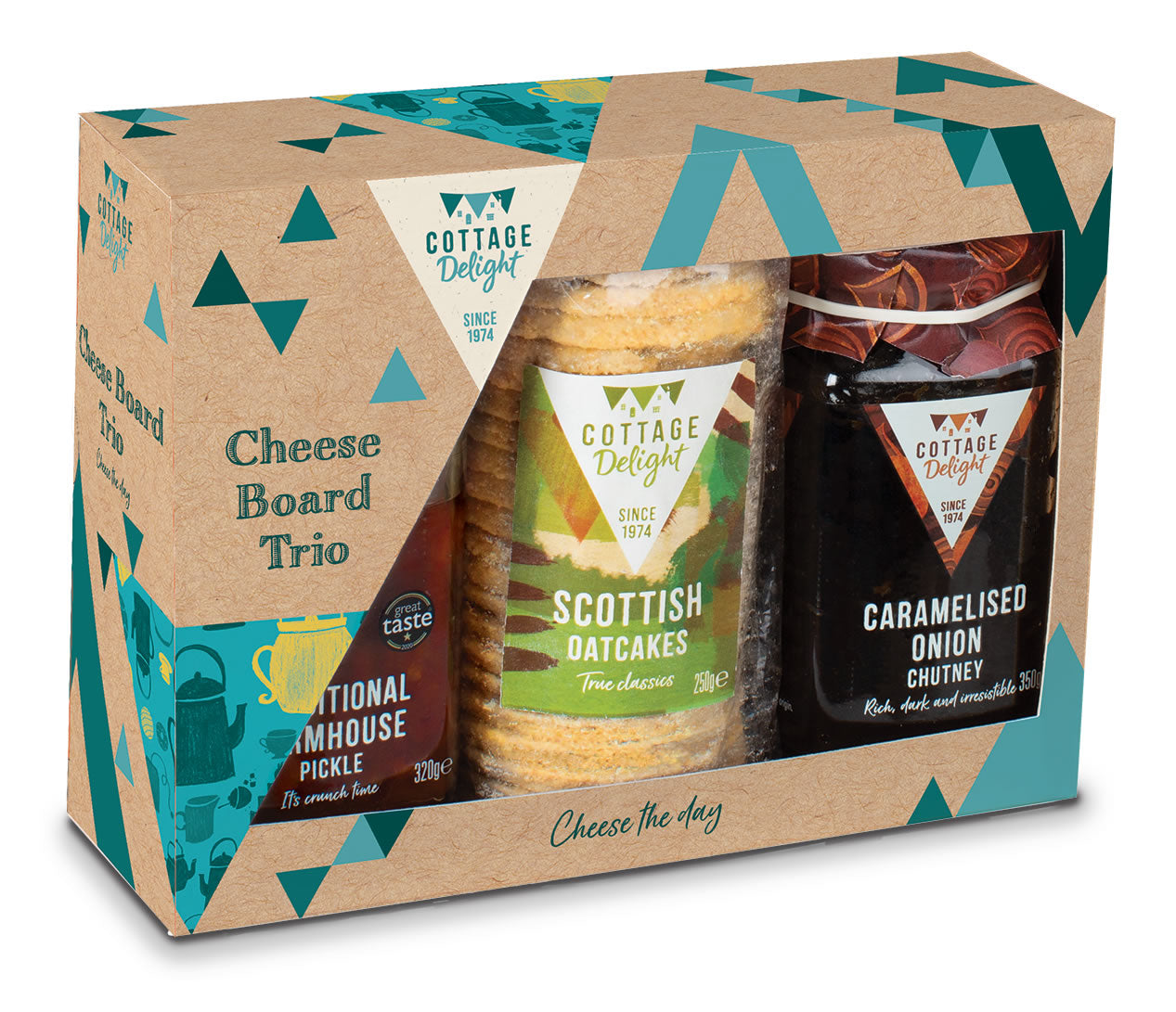 Traditional Farmhouse Pickle 320g. Scottish Oatcakes 250g. Caramelised Onion Chutney 350g. Vegetarian and Vegan.