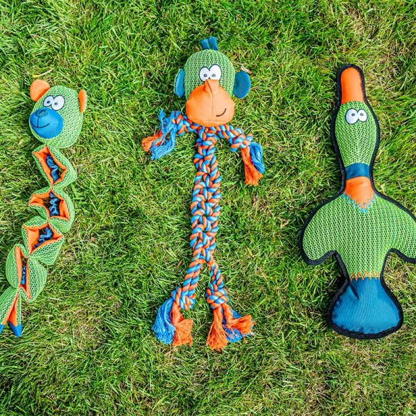 Tough Fabric squeaky dog toy. Improve sensory play experience. Tested for safety. 11 x 49 x 30 cm.