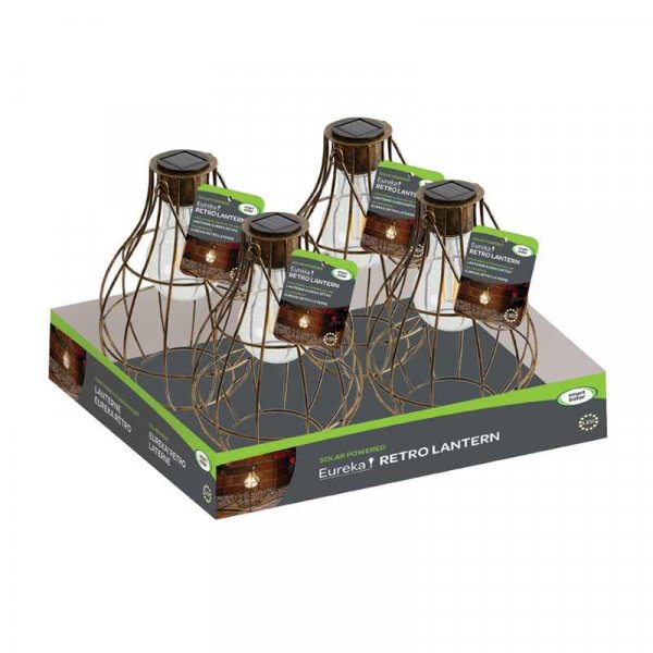 2 filament LEDs create a vintage lighting effect. Can be used as a table top or hanging lantern. Robust metal and glass globe design. Charges in direct sunlight. Automatically illuminates at night. 32 x 23.5 cm.