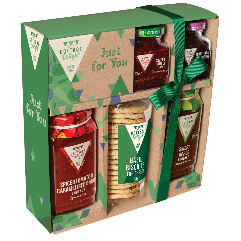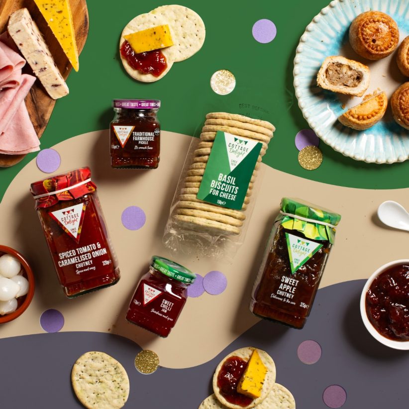 Indulge in this signature selection of three delicious chutneys and pickle, savoury jam and crumbly Scottish oatcakes. Vegan and Vegetarian