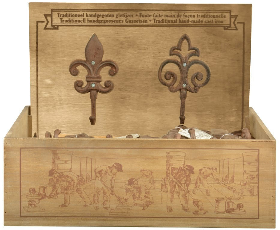 The rustic cast iron hook with flue-de-lis design can easily be mounted by the two fixing holes. Each hook is hand cast according to age-old tradition and craftsmanship. Fixings not included. Pack Size 1.