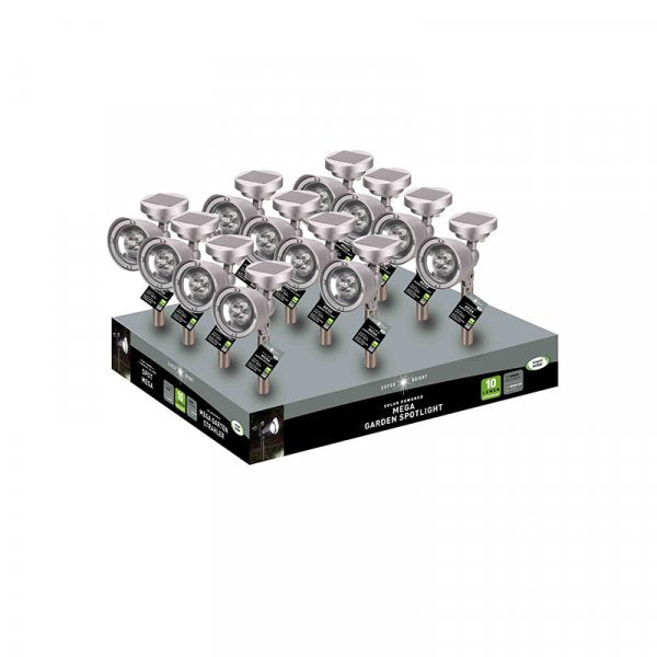 Super Bright spotlight with stake. Directional light is easy to adjust. Up to 6 hours run time. 20 Lumens. 3 white LEDs per spotlight. Charges in direct sunlight. Automatically turns on at night. 33 x 17.5 cm.