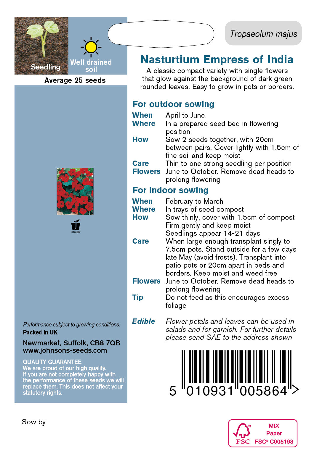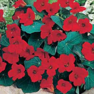 A classic compact variety with red, single flowers that glow against the background of dark green rounded leaves. Easy to grow in borders or pots. Hardy Annual. Indian Cress. Tropaeolum majus.