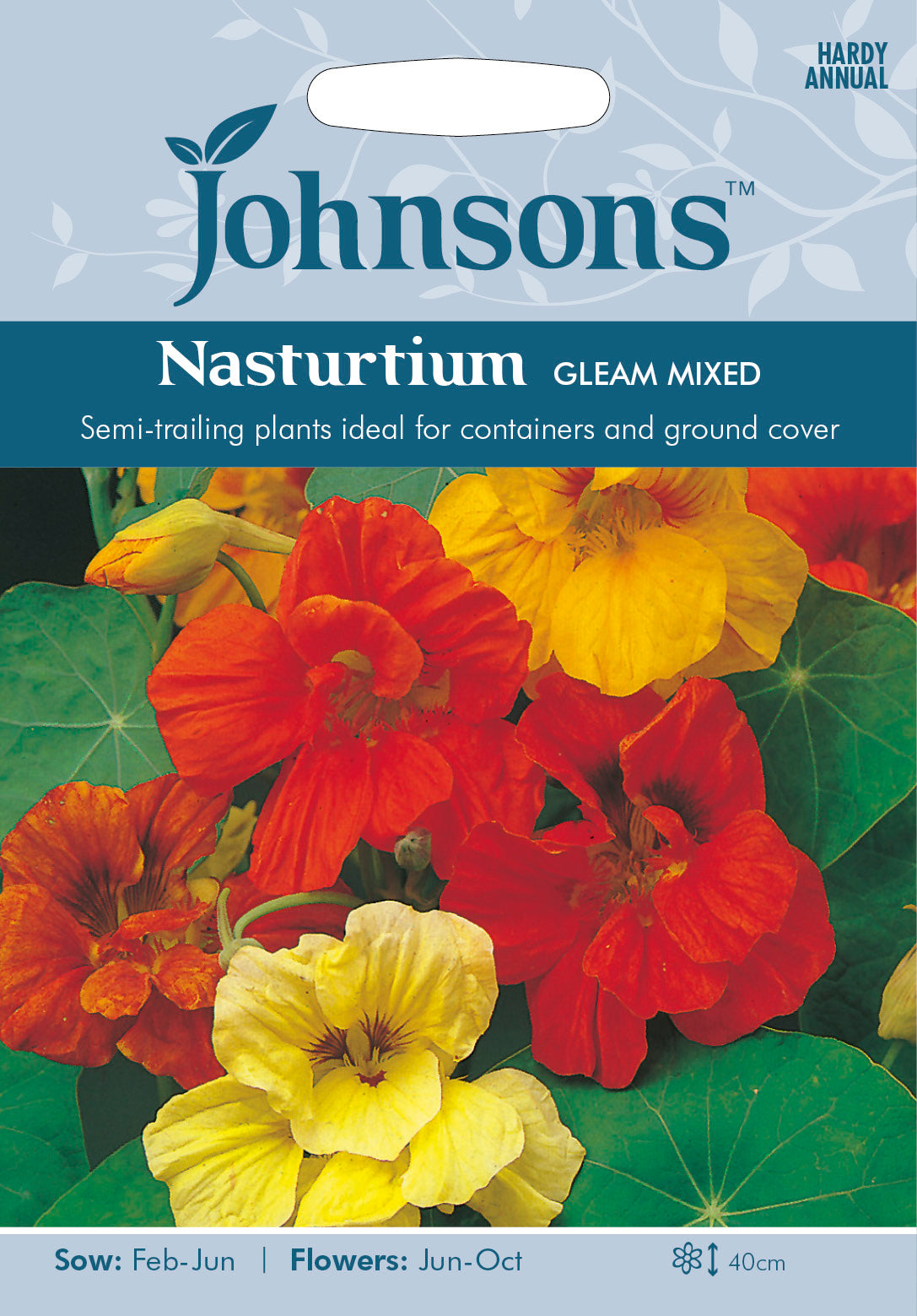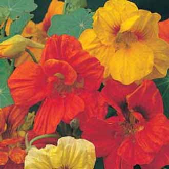 A prolific and free flowering mix of bright semi-double flowers. Popular in annual beds and containers or as easy, cheerful ground cover. Hardy Annual. Indian Cress. Tropaeolum majus.