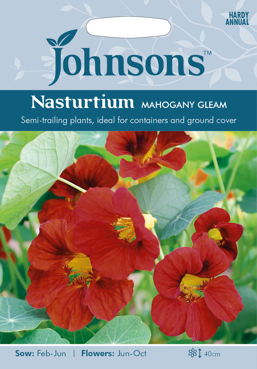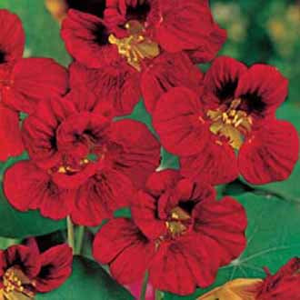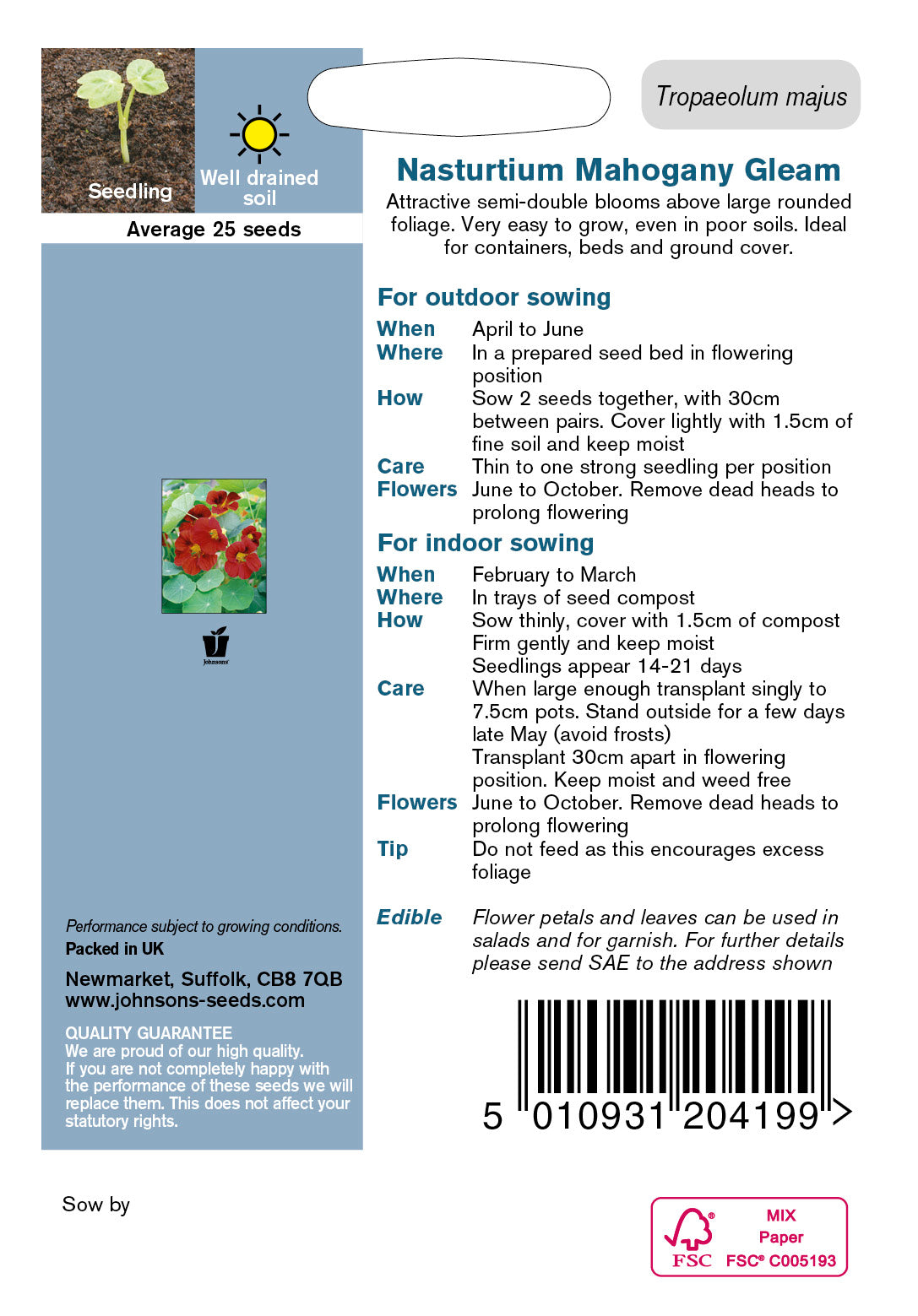 Attractive semi-double blooms above large rounded foliage. Very easy to grow, even in poor soils, ideal for all types of containers, annual beds and ground cover. Hardy Annual. Indian Cress. Tropaeolum majus.