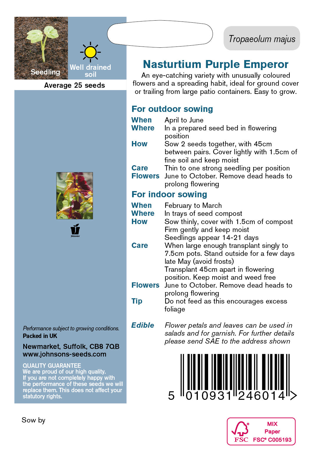 An eye catching variety with uniquely coloured flowers and a spreading habit, ideal for ground cover or trailing from large patio containers. Easy to grow even on poor soils. Hardy Annual. Tropaeolum majus.