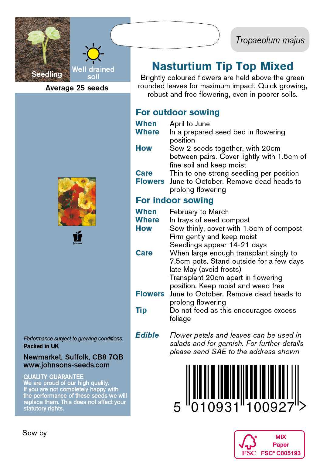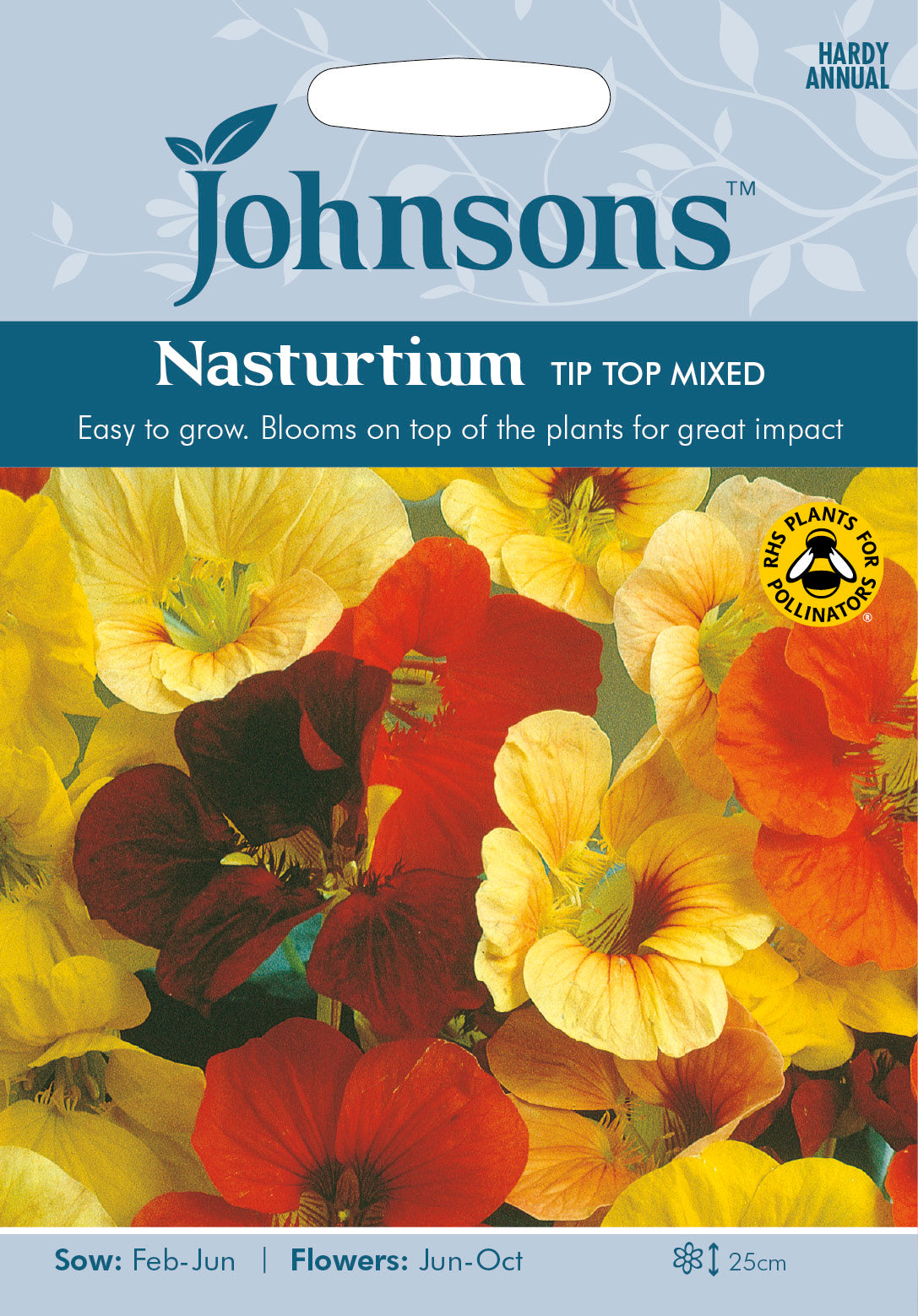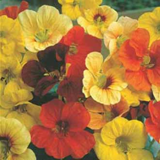 Brightly coloured flowers form above the green rounded leaves for maximum impact. Quick growing, robust and free flowering, even in poorer soils. Indian Cress. Tropaeolum majus.