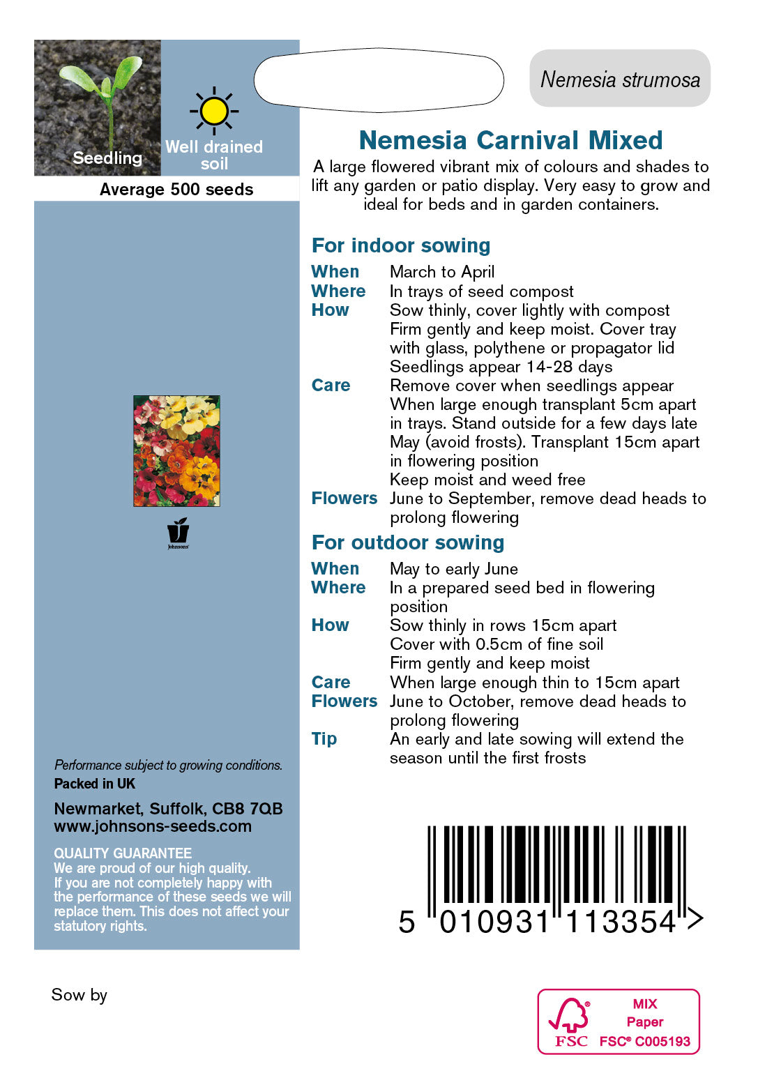 A large flowered vibrant mix of colours and shades to lift any garden or patio display. Very easy to grow and ideal for beds and in garden containers. Half Hardy Annual. Nemesia strumosa.