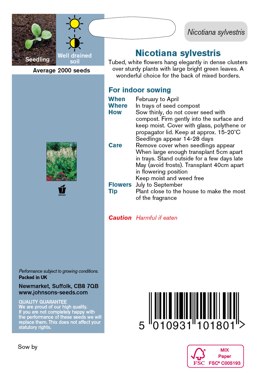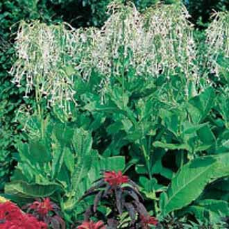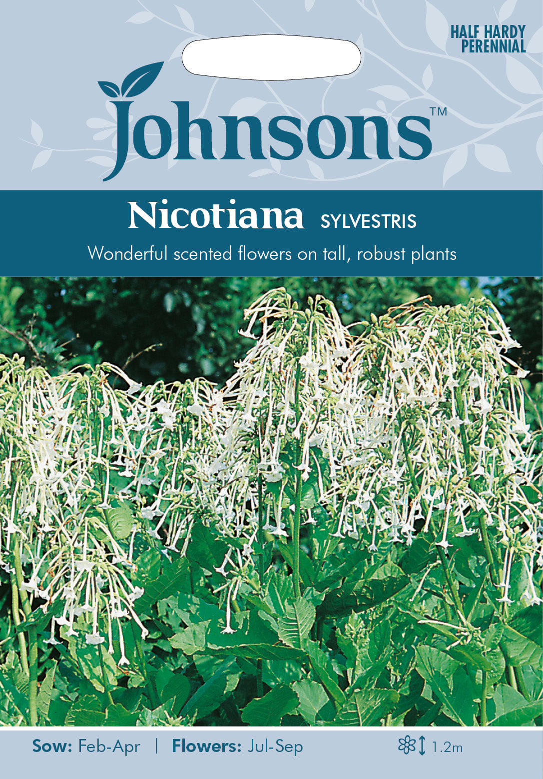 Tubed, white flowers hang elegantly in dense clusters over sturdy plants with large bright green leaves. A wonderful choice for the back of mixed borders. Half Hardy Perennial. Nicotiana sylvestris.
