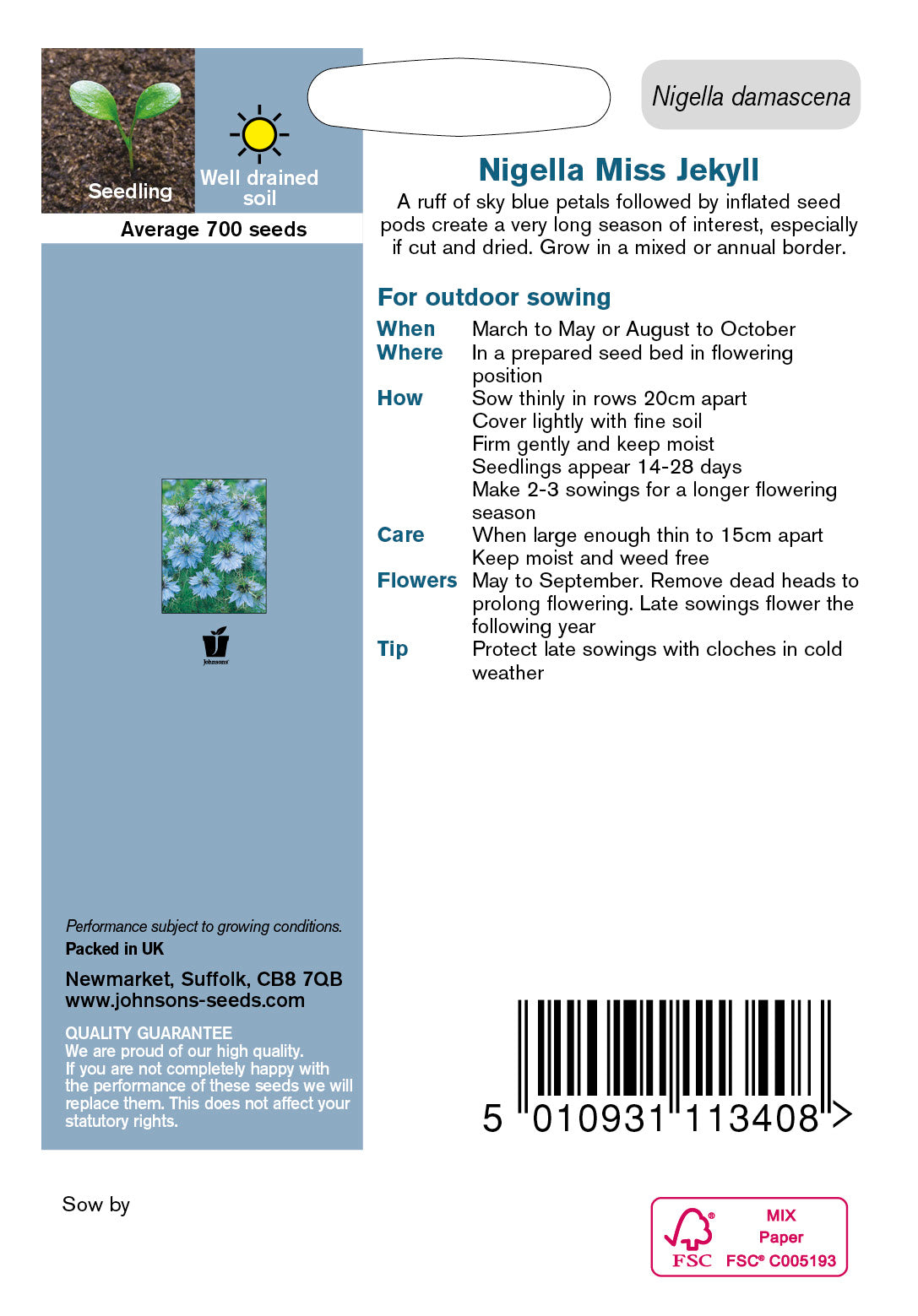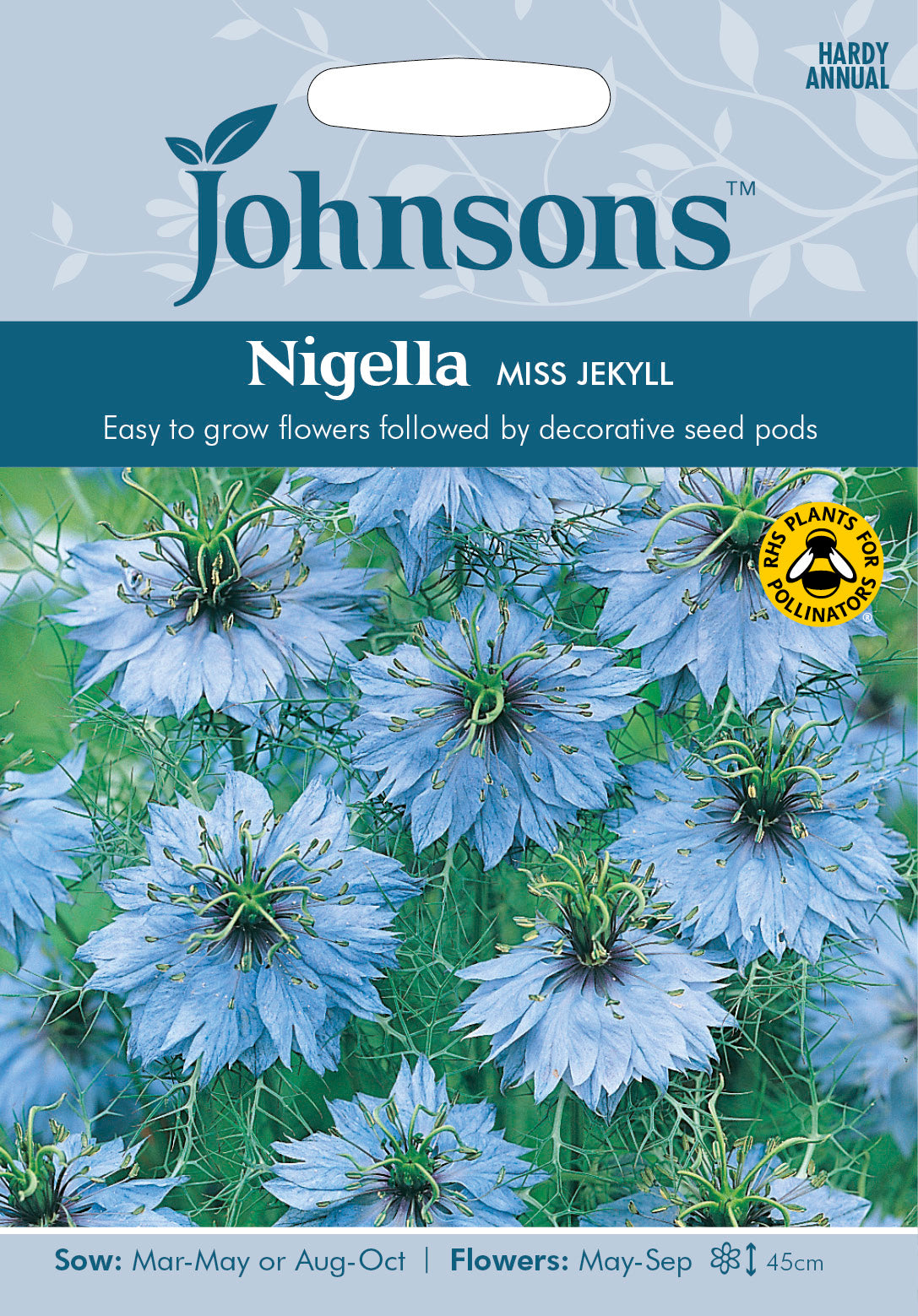 A ruff of sky blue petals followed by inflated seed pods create a very long season of interest, especially if cut and dried. Grow in an informal mixed or annual border. Hardy Annual. Nigella damascena.