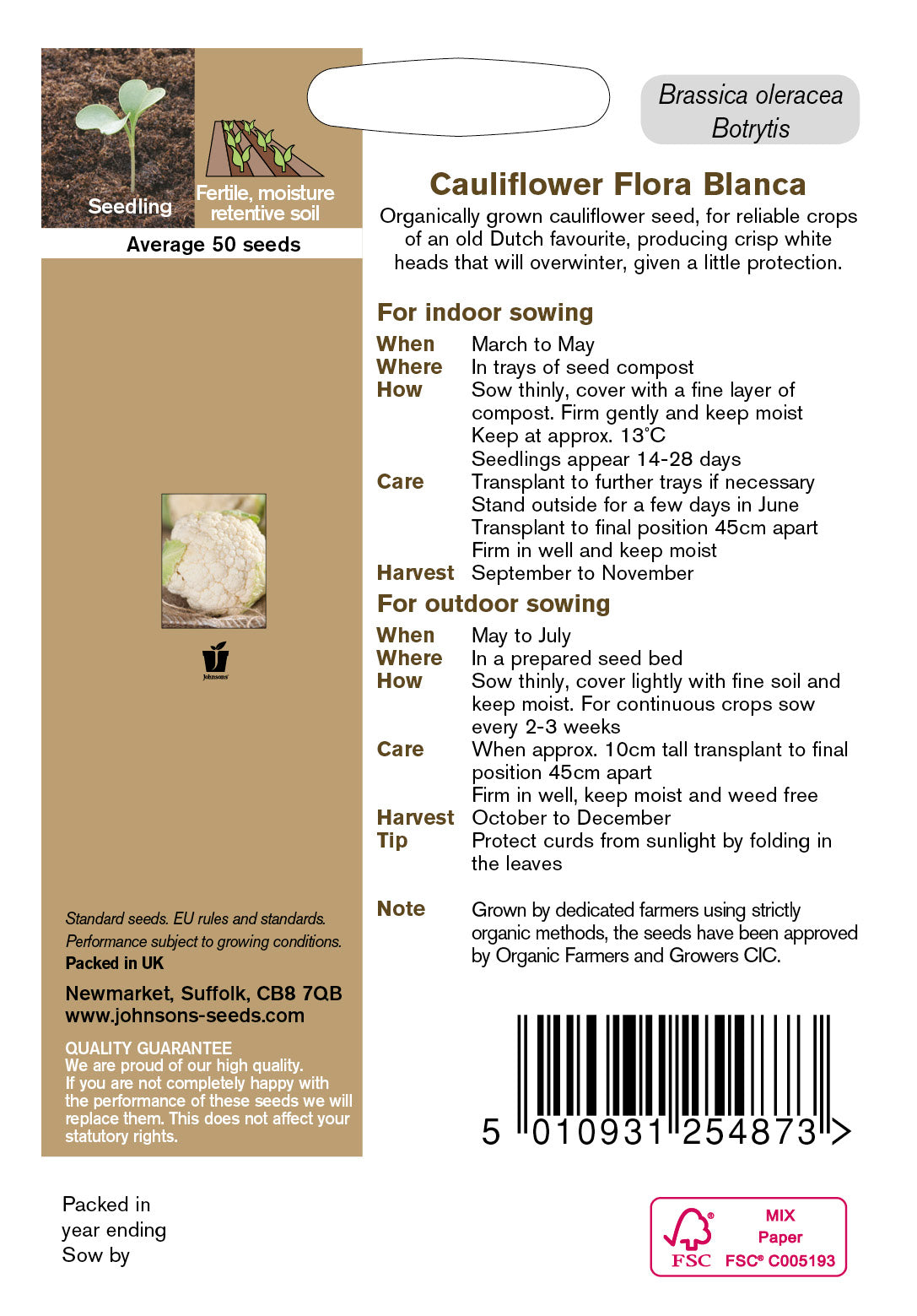 Organically grown cauliflower seed, for reliable crops of an old Dutch favourite, producing crisp white heads that will overwinter, given a little protection. Brassica oleracea Botrytis.