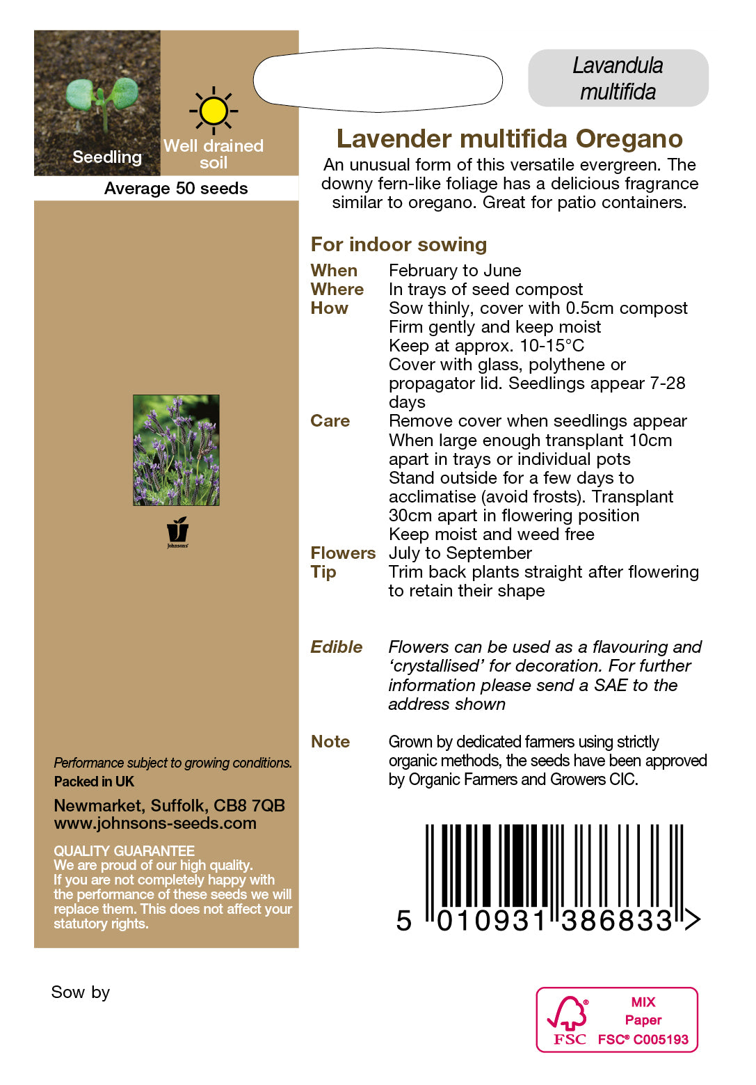 An unusual form of this versatile evergreen. The downy fern-like foliage has a delicious fragrance similar to oregano. Great for patio containers. Hardy Shrub. Lavandula multifida.