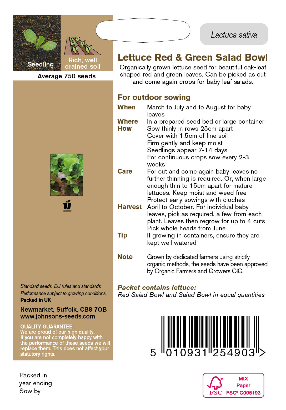 Organically grown lettuce seed for beautiful oak-leaf shaped red and green leaves. Can be picked as cut and come again crops for baby leaf salads. Lactuca sativa.