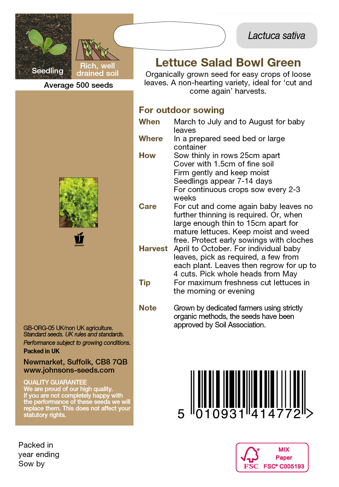 Organically grown seed for easy crops of loose leaves. A non-hearting variety, ideal for ‘cut and come again’ harvests. Lactuca sativa.