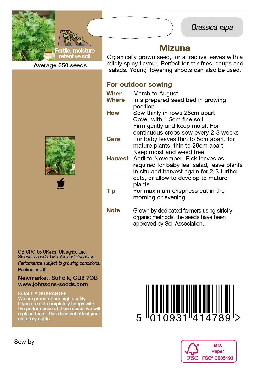 Organically grown seed, for attractive leaves with a mildly spicy flavour. Perfect for stir-fries, soups and salads. Young flowering shoots can also be used. Brassica rapa.