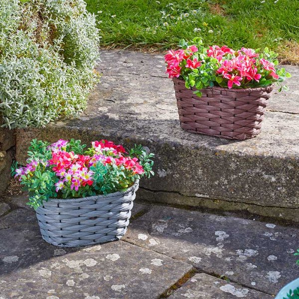Maintenance free home décor. Realistic, no maintenance artificial basket arrangement. Weather and UV resistant. 22 x 25 cm.