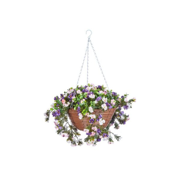 Realistic, zero maintenance artificial hanging basket. Faux rattan basket complete with artificial flowers. Weather and UV resistant Banana braid basket. Complete with 3-way galvanised hanging chain. 57 x 30 x 30 cm.