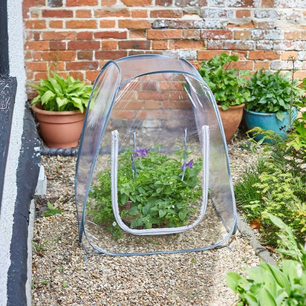 Ideal for 'growing on' seedings, tender plants and hanging baskets. Helps to prevent damage from wind and frosts. Convenient 'Pop-Up' design. Simple to fit, remove and store. Zipped access panel with ties. Can be secured on open ground or patios and