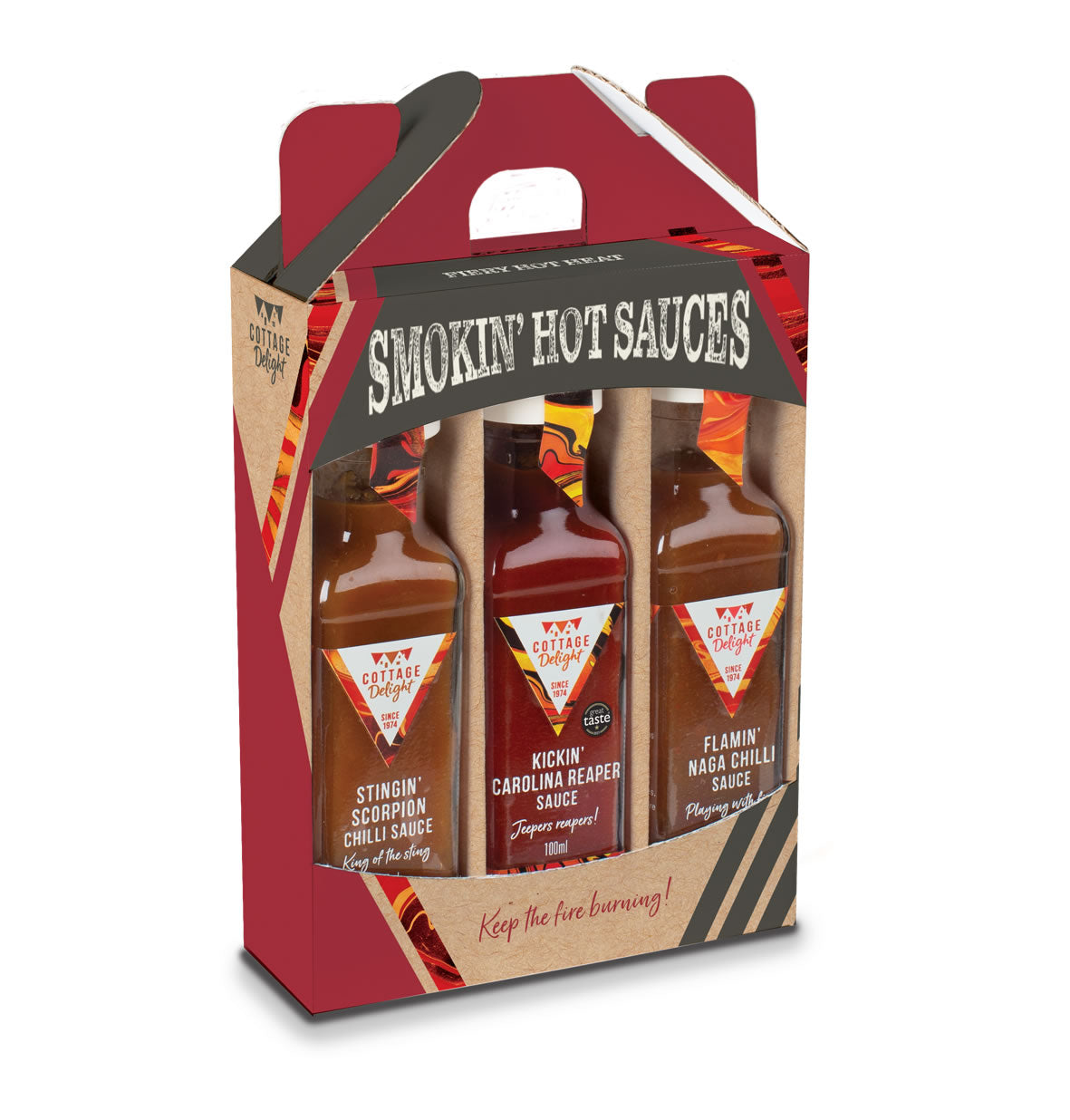 Stingin’ Scorpion Chilli Sauce 100ml. Kickin’ Carolina Reaper Sauce 100ml. Flamin’ Naga Chilli Sauce 100ml. Vegetarian, Vegan and Gleten Free.