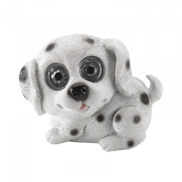 Decorative dog by day. Eyes light at night. Charges in direct sunlight.