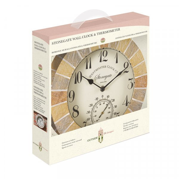 Arabic numbers and skip hand movement. Quartz accuracy. Weather resistant hand-painted polyresin. Centigrade & Fahrenheit reading. Diameter: 10 inches. For both indoor and outdoor use.