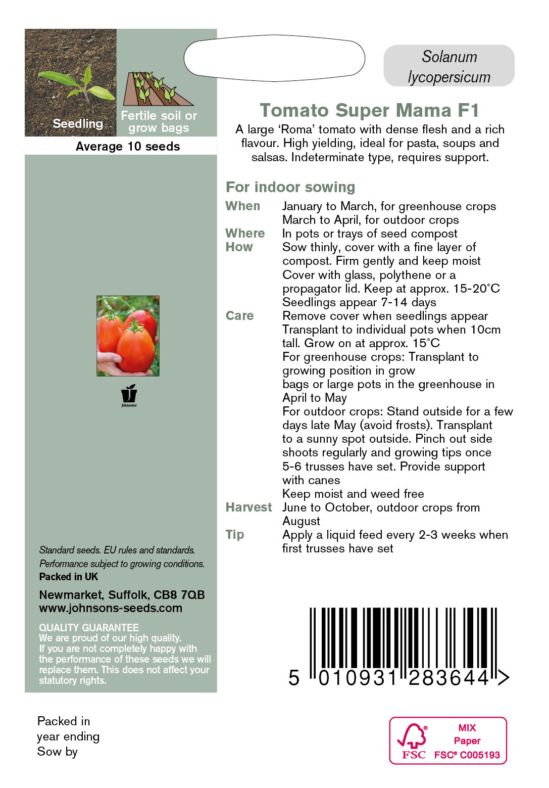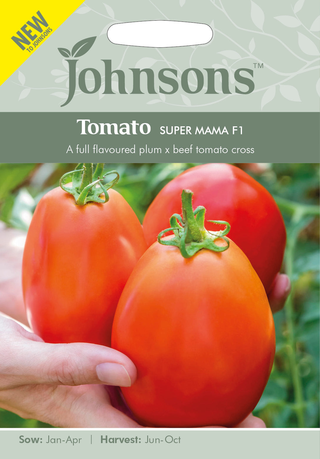 A large ‘Roma’ tomato with dense flesh and a rich flavour. High yielding, ideal for pasta, soups and salsas. Indeterminate type, requires support. Solanum lycopersicum.
