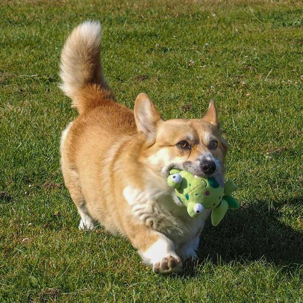 Squeaky plush dog toy. Improve sensory play experience. Tested for safety. 12.5 x 13 x 8 cm.