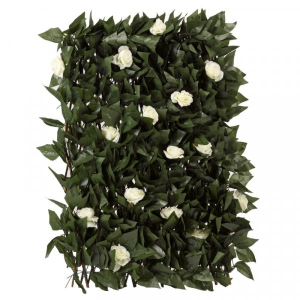Natural-looking white roses adorn this expandable willow trellis. Use vertically or horizontally. A stylish alternative to traditional fencing.
